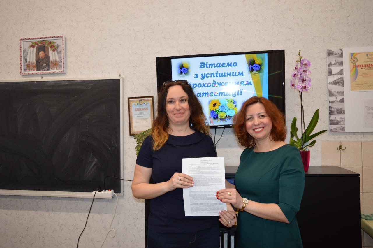 За результатами комплексного оцінювання педагогічної діяльності педагогічних працівників, атестаційною комісією І рівня фахового медико-фармацевтичного коледжу винесено рішення: присвоїти кваліфікаційну категорію «спеціаліст ІІ категорії» викладачкам циклової комісії української мови та літератури з іноземною мовою Гулак Алісі Миколаївні, Клименко Ользі Романівні, Вонсович Юлії Володимирівні, викладачці циклової комісії природничо-наукових дисциплін Климач Тетяні Миколаївні; присвоїти кваліфікаційну категорію «спеціаліст І категорії» викладачці циклової комісії професійних медсестринських дисциплін Невмержицькій Валентині Іванівні, практичному психологу фахового медико-фармацевтичного коледжу Климач Тетяні Миколаївні; підтвердити відповідність кваліфікаційній категорії «спеціаліст першої категорії» викладачці циклової комісії професійних медсестринських дисциплін Школьній Олені Віталіївні.