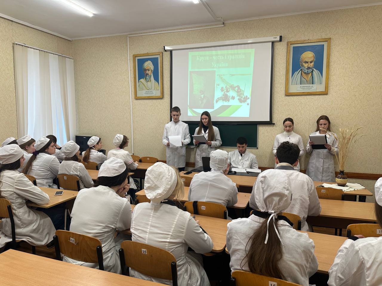 Саме тому 29 січня викладач історії України, кандидат філософських наук Вікторія Прокопенко провела для студентів перших курсів інформаційно-виховну годину на тему «Крути – честь і трагедія України».