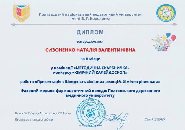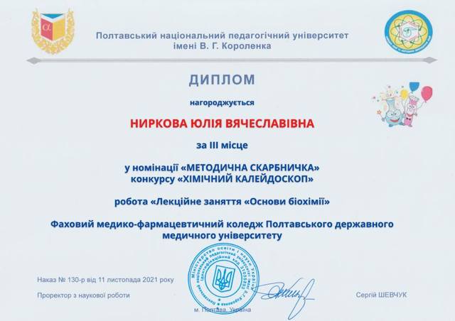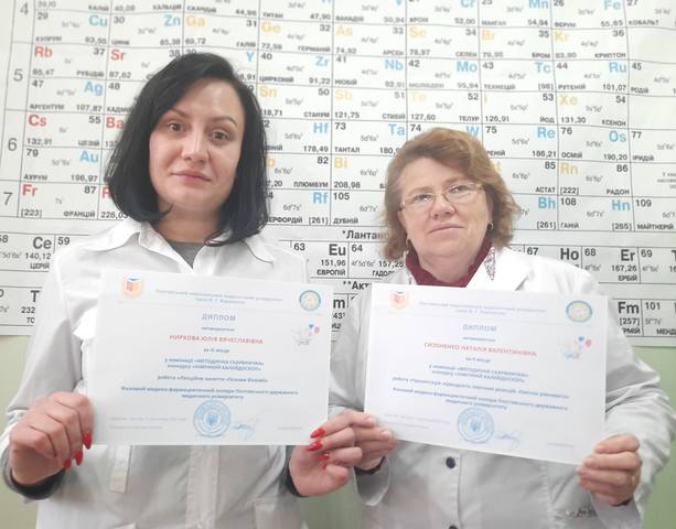 У номінації «Методична скарбничка» взяли участь голова циклової комісії ФМФК хіміко-математичних дисциплін Сизоненко Наталія та викладач цієї ж комісії Ниркова Юлія. Були представлені методичні матеріали: мультимедійна презентація «Швидкість хімічних реакцій. Хімічна рівновага» і методична розробка лекційного заняття «Ліпіди. Класифікація ліпідів. Стуктура та функції ліпідів. Перетворення жирів. Всмоктування ліпідів. Проміжний обмін. Транспорт та депонування ліпідів. Ліпопротеїни плазми. Гіперліпопротеїнемії. Патологія ліпідного обміну: атеросклероз, ожиріння, цукровий діабет».