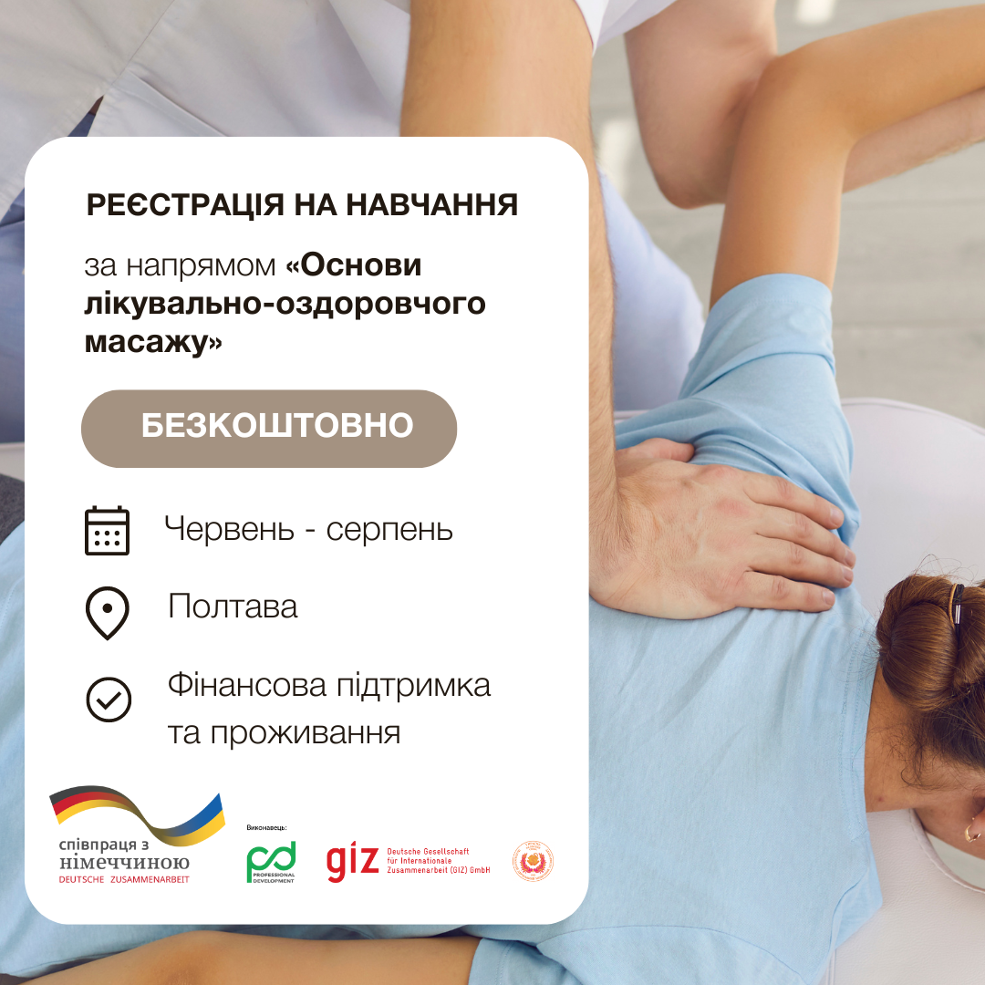 📌Команда Полтавського державного медичного університету та ГО «Український професійний розвиток» оголошують набір учасників та учасниць на короткострокові професійні навчальні курси за сертифікатною програмою «Основи лікувально-оздоровчого масажу».