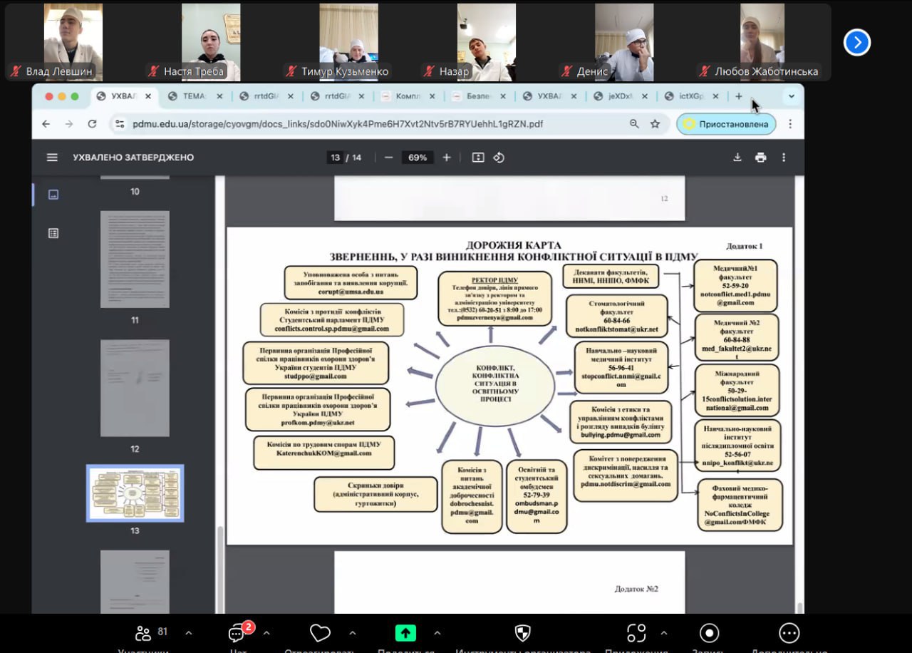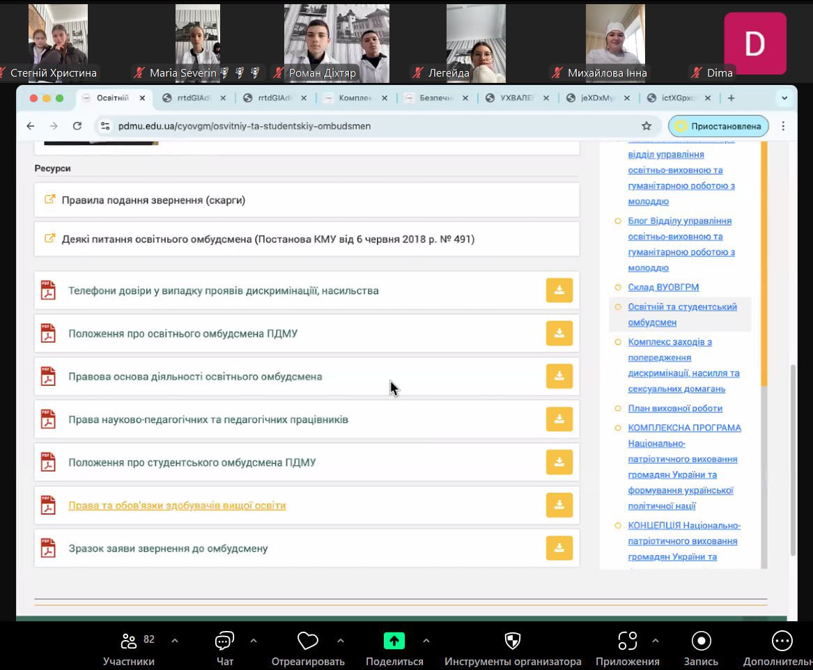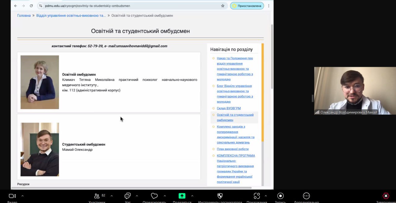 30 жовтня для студентів 1-го курсу відбулася онлайн-зустріч із омбудсменом Полтавського державного медичного університету Олександром Мамаєм, під час якої обговорювалися питання створення безпечного освітнього середовища. Учасники дізналися про свої права й обов'язки, а також ознайомилися з «дорожньою картою звернень, у разі виникнення конфліктних ситуацій».