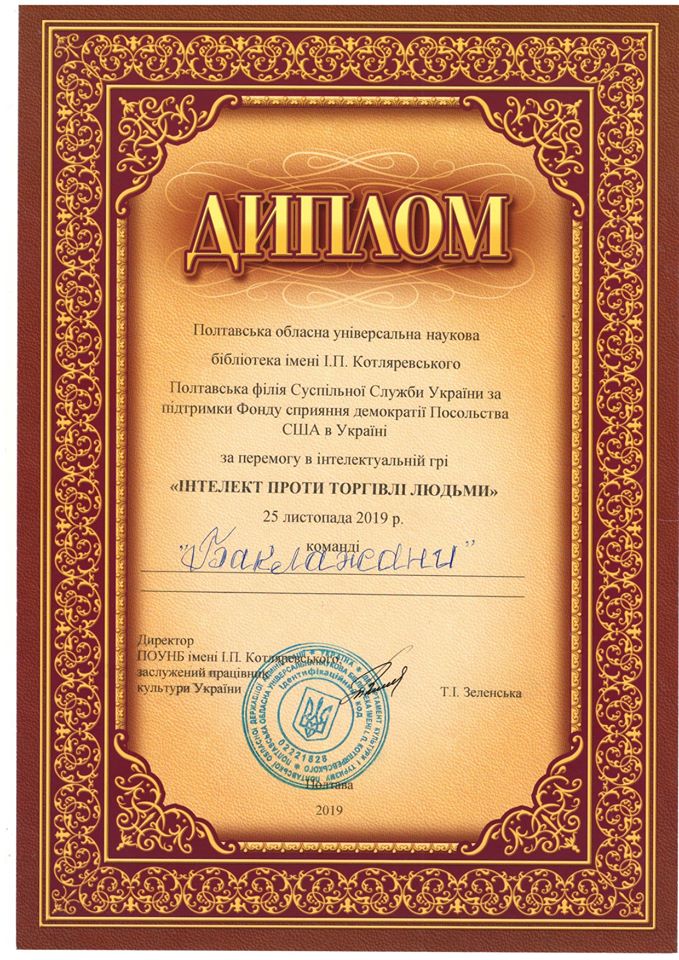 Вітаємо команду «Баклажани» (керівник – викладач Бажан Є.А.) медичного коледжу УМСА з перемогою в інтелектуальній грі «Інтелект проти торгівлі людьми», ініційованої Полтавською філією Суспільної Служби України за підтримки Фонду сприяння демократії Посольства США в Україні, що проходила на базі Полтавської обласної універсальної наукової бібліотеки ім.. І.П.Котляревського.