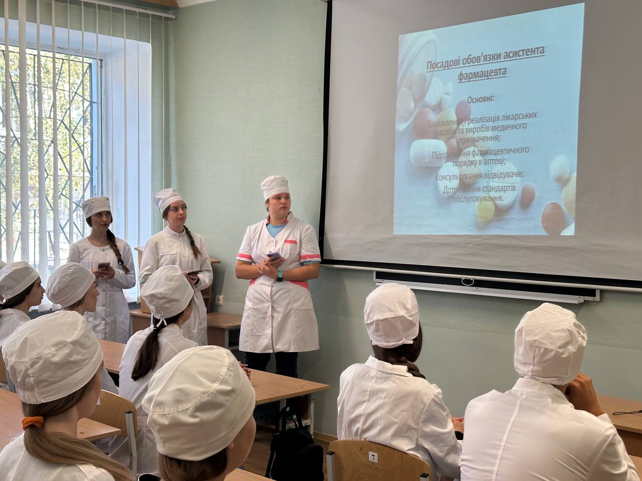 Студентки 3-го курсу фармацевтичного відділення підготували цікаву презентацію про обрану професію. Вони проінформували, що спеціальність вимагає великої відповідальності та постійного навчання. Асистент фармацевта має володіти такими якостями як: відповідальність, порядність, чесність, бажання допомогти людині швидше одужати.