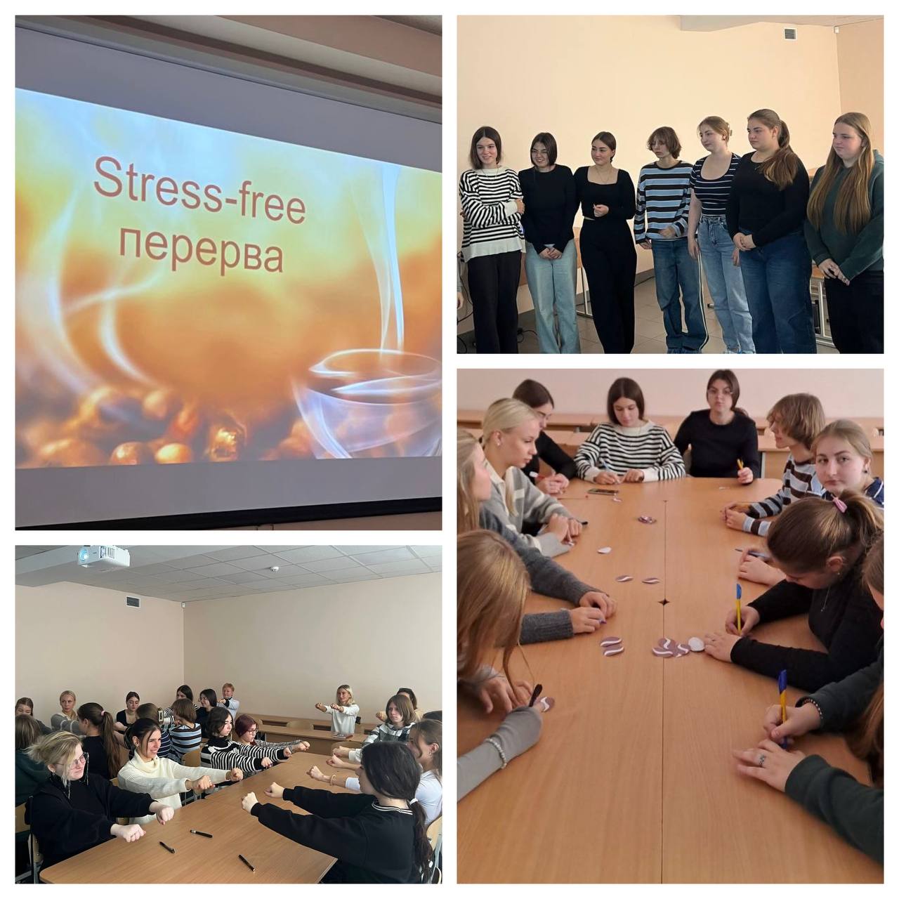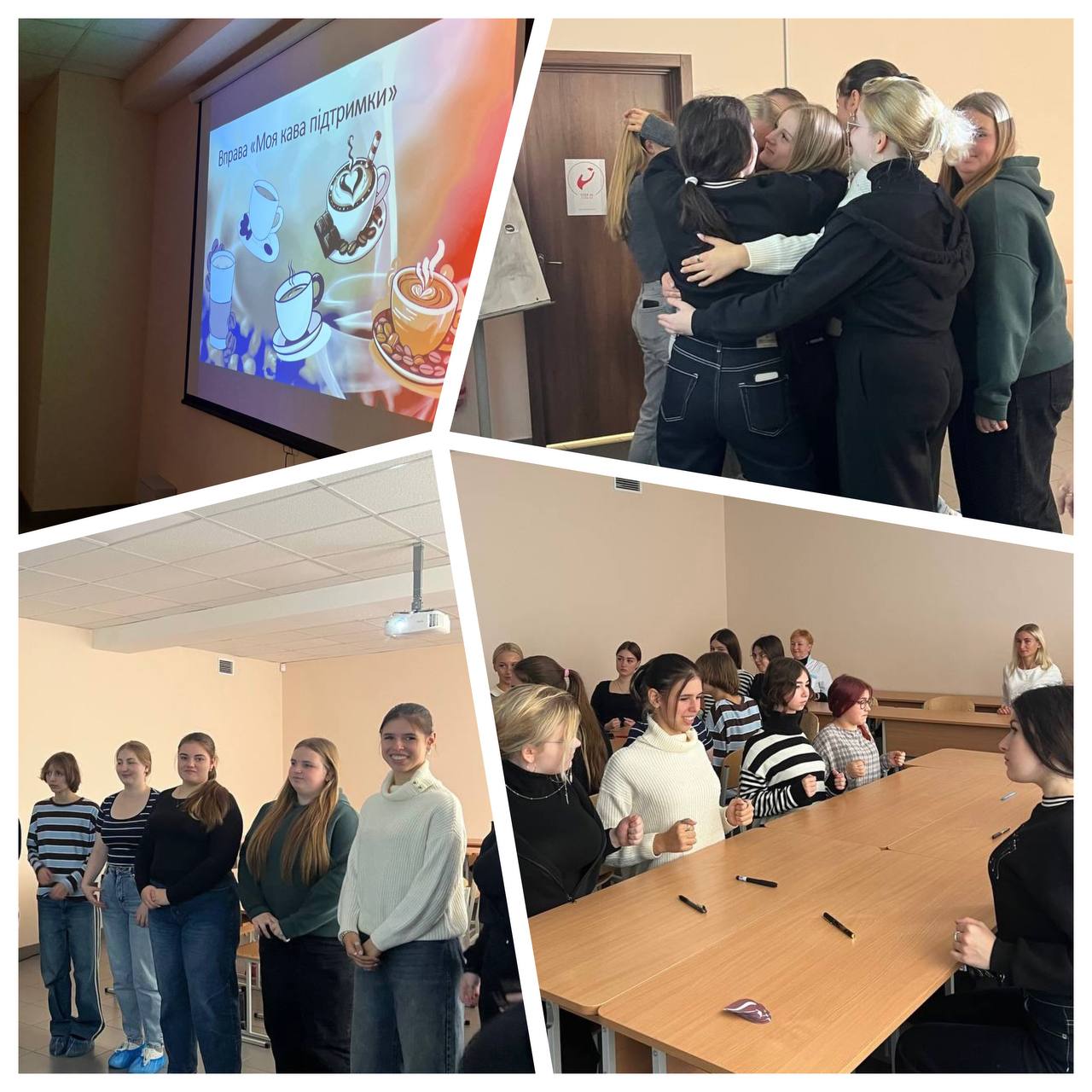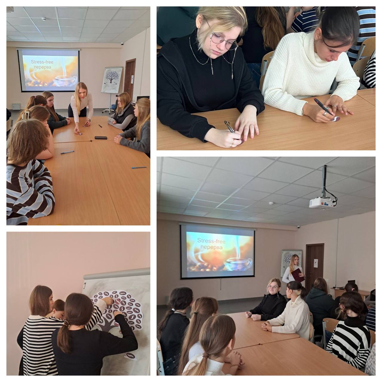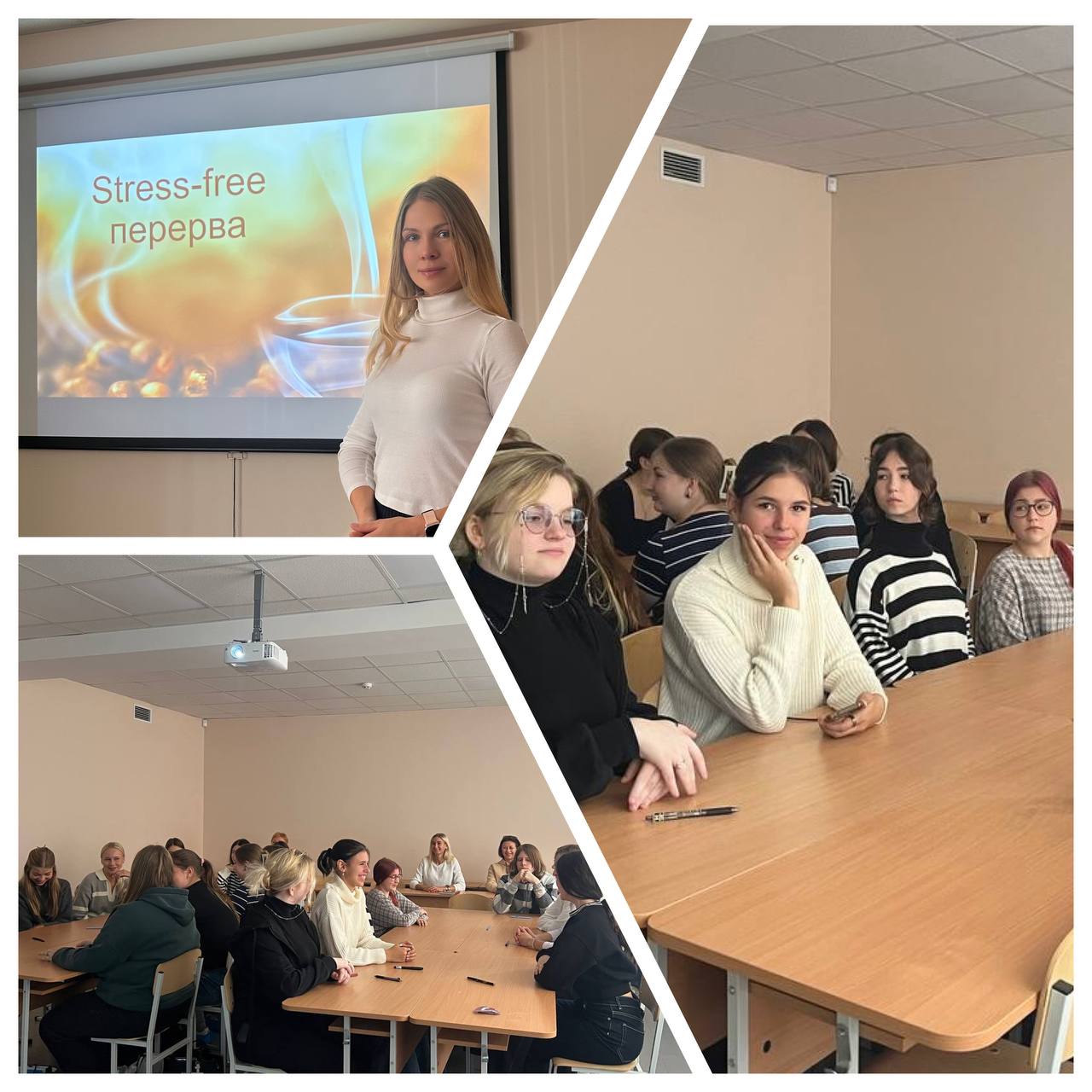 У Фаховому медико-фармацевтичному коледжі до Дня ментального здоровʼя викладачкою Юлією Вонсович була проведена виховна година з елементами тренінгу «Stress-free перерва». Атмосфера заходу була створена у стилі затишної кав’ярні, де студенти мали можливість відчути себе комфортно та розслаблено.