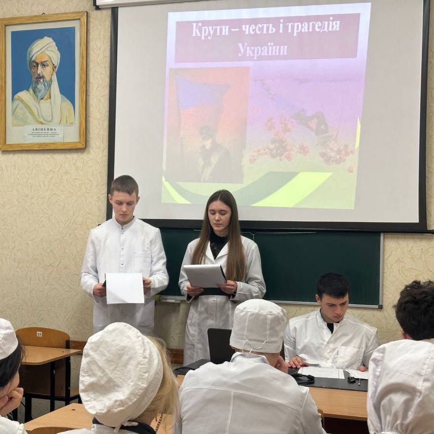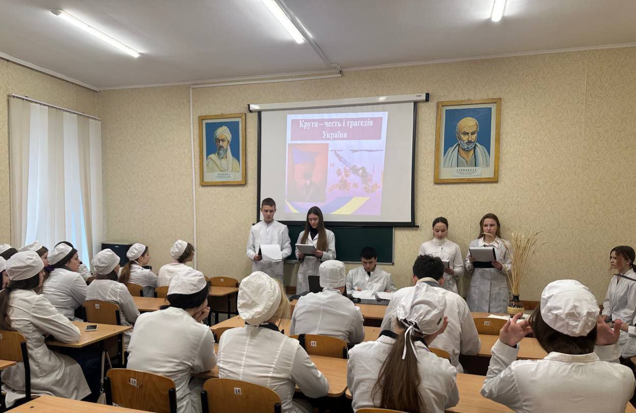 Викладач Вікторія Прокопенко провела інформаційно-виховну годину на тему «Крути – честь і трагедія України», під час якої здобувачі освіти ознайомилися з історичним контекстом бою під Крутами, що відбувся 29 січня 1918 року. Учасники заходу дізналися про роль студентів і гімназистів, які, попри значну перевагу ворога, стали на захист Української Народної Республіки, проявивши незламну силу духу та самопожертву. У ході заходу було підкреслено значення подвигу молодих добровольців, які віддали свої життя за незалежність України.