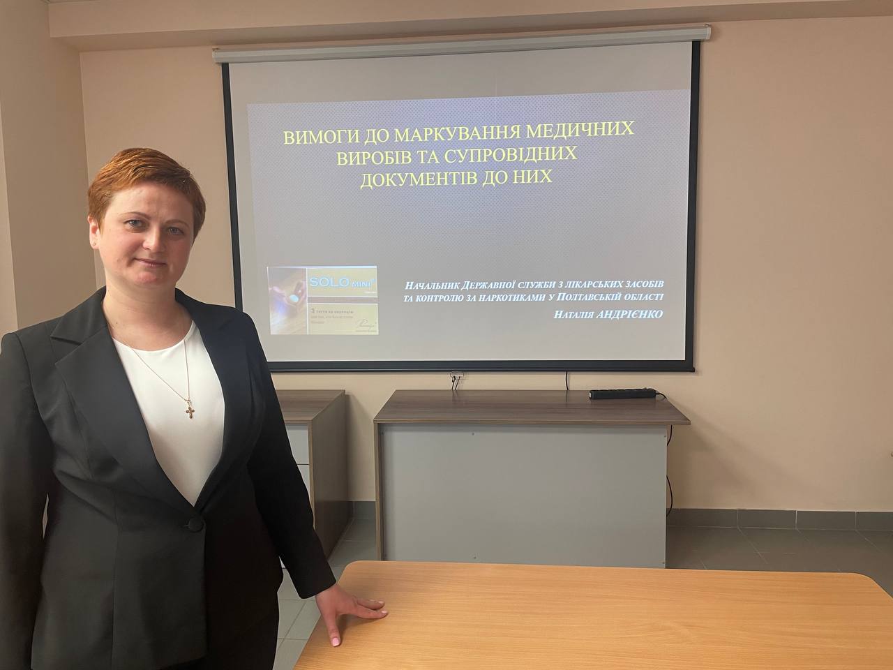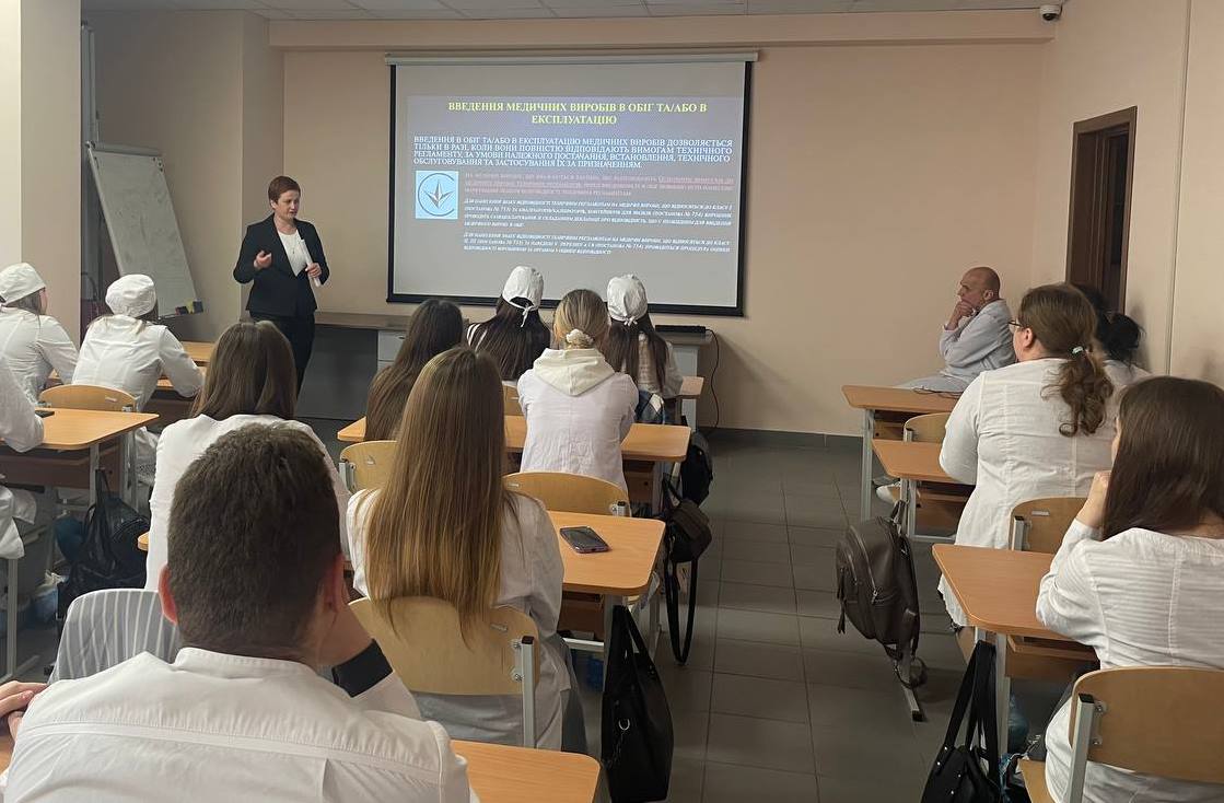 03.05.2024 р. начальником Державної служби з лікарських засобів та контролю за наркотиками, доктором філософії Наталією Андрієнко проведена гостьова лекція на тему «Вимоги до медичних виробів та супровідних документів до них». Лектор ознайомила здобувачів освіти з необхідною документацією та вимогами до неї, яка повинна супроводжувати медичні вироби під час реалізації. Отримані знання під час лекції дуже актуальні для професійної діяльності майбутніх фахівців.