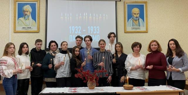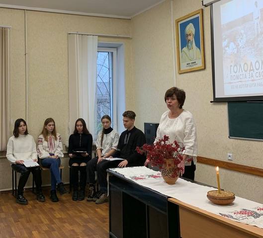 Завершилося вшанування пам'яті жертв Голодомору проведенням вечора пам`яті, який організувала викладач, к.істор.н. Гончаренко Н.І. Учасники заходу на конкретних прикладах проілюстрували кричущі наслідки сталінського режиму, наголосивши на важливості збереження пам'яті про загиблих заради миру та злагоди в соборній Україні.