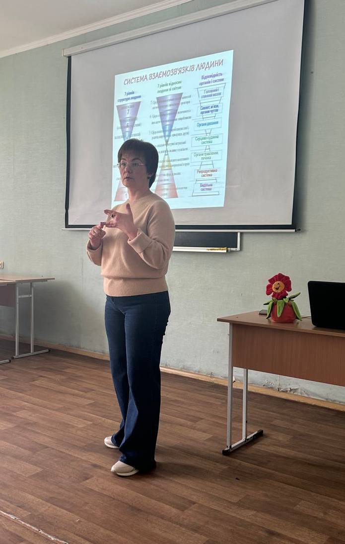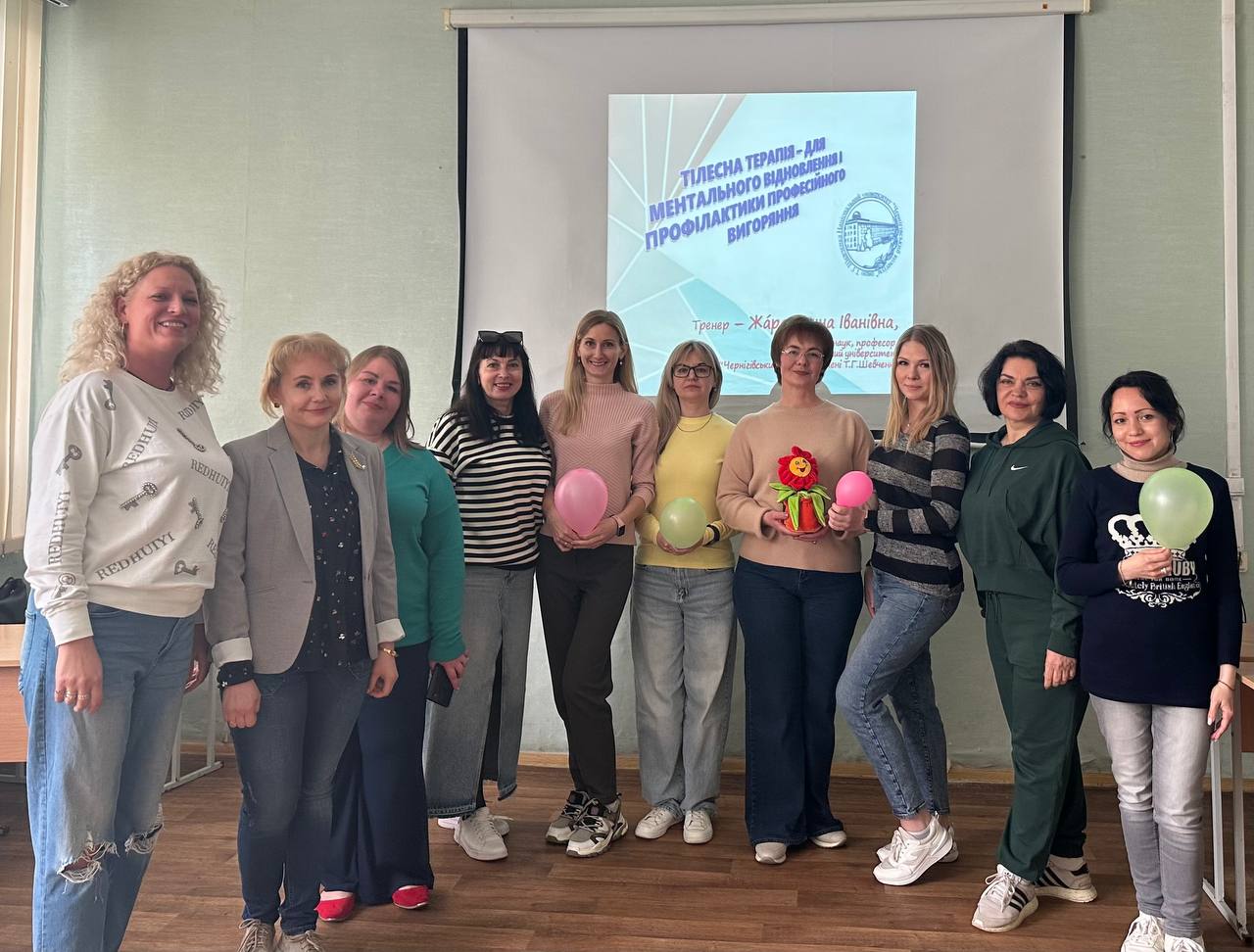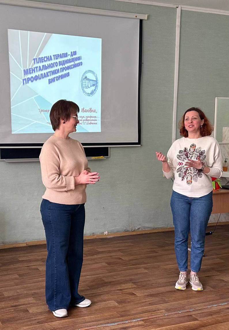 25 квітня 2024 доктором педагогічних наук, професором, професором кафедри біологічних основ фізичного виховання, здоров'я і спорту Національного університету "Чернігівський колегіум" імені Т.Г. Шевченка Ганною Жарою для співробітників Навчально-наукового медичного інституту та Фахового медико-фармацевтичного коледжу проведено тренінг «Тілесна терапія – для ментального відновлення і профілактики професійного вигорання».