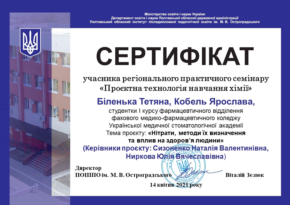 Здобувачі освіти першого курсу фармацевтичного відділення фахового медико-фармацевтичного коледжу академії Тетяна Біленька та Ярослава Кобель взяли участь у регіональному практичному семінарі «Проєктна технологія навчання хімії», що проходив в онлайн режимі на базі Полтавського обласного інституту післядипломної педагогічної освіти імені М.В. Остроградського.
