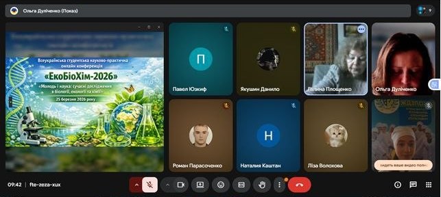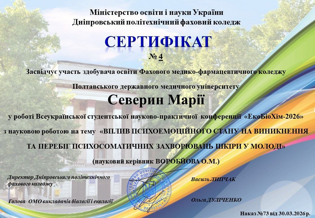 Здобувачка освіти 2 курсу ОПП Стоматологія ортопедична Марія Северин (науковий керівник докт. філос. Оксана Воробйова) взяла участь у Всеукраїнській студентській науково-практичній конференції «ЕкоБіоХім-2026» на тему «Молодь і наука: сучасні дослідження в біології, екології та хімії», що відбулась 25 березня у м.Дніпро.
