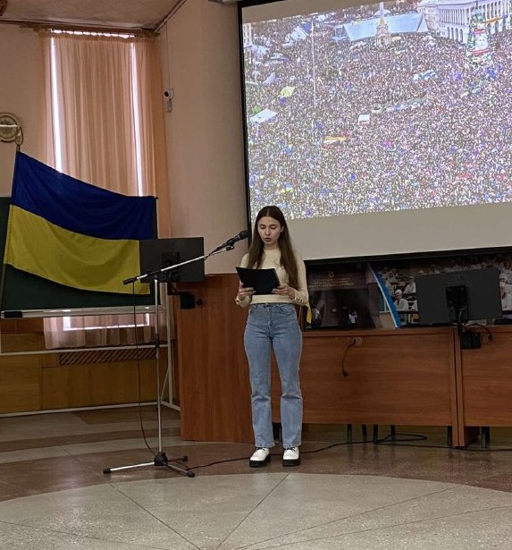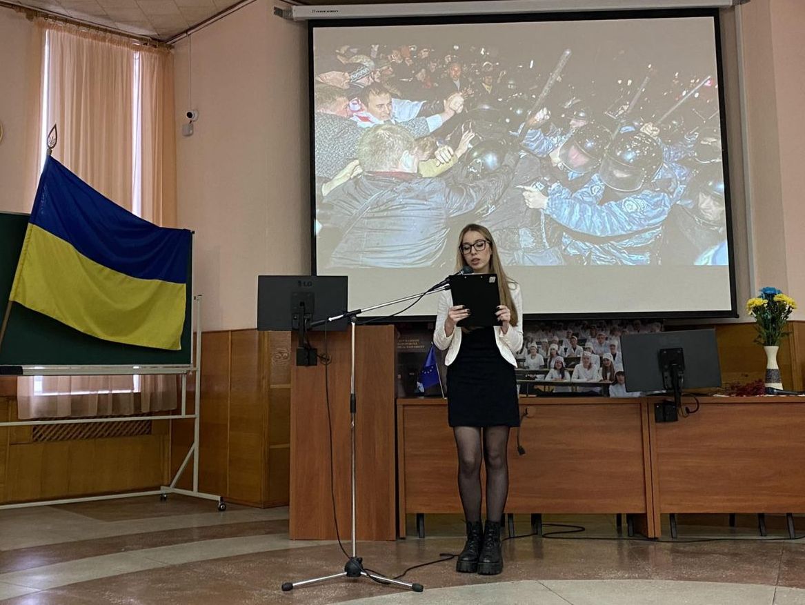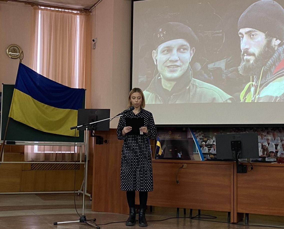 Юнаки й дівчата віддали належну шану патріотизму, національній відвазі і самовідданості учасників Революції Гідності, які захищали честь і волю Батьківщини, своє священне право бути Українцем. Пам’ять героїв Небесної Сотні, що журавлиним ключем полинули у вирій вічності, студенти вшанували хвилиною мовчання під неперевершений акапельний спів Лізи Івахненко пісні-реквієму «Пливе кача…». Слухачі не могли стримати сліз.