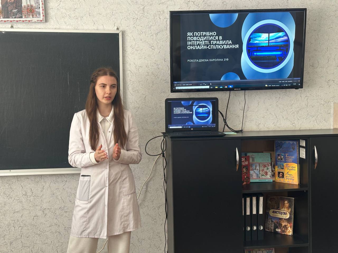Студентка другого курсу ОПП Фармація Кароліна Дзюба провела для першокурсників виховний захід «Як потрібно поводитися в інтернет-просторі. Правила онлайн-спілкування», метою якого було обговорення питань формування позитивної онлайн-комунікації, важливості дотримання цифрового етикету, а також способів захисту від кібербулінгу та уникнення конфліктів у соціальних мережах.