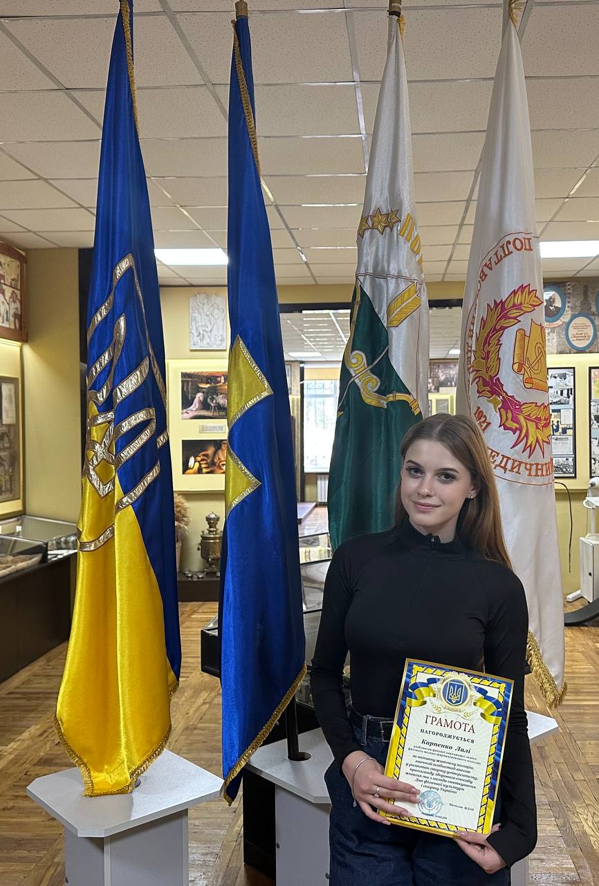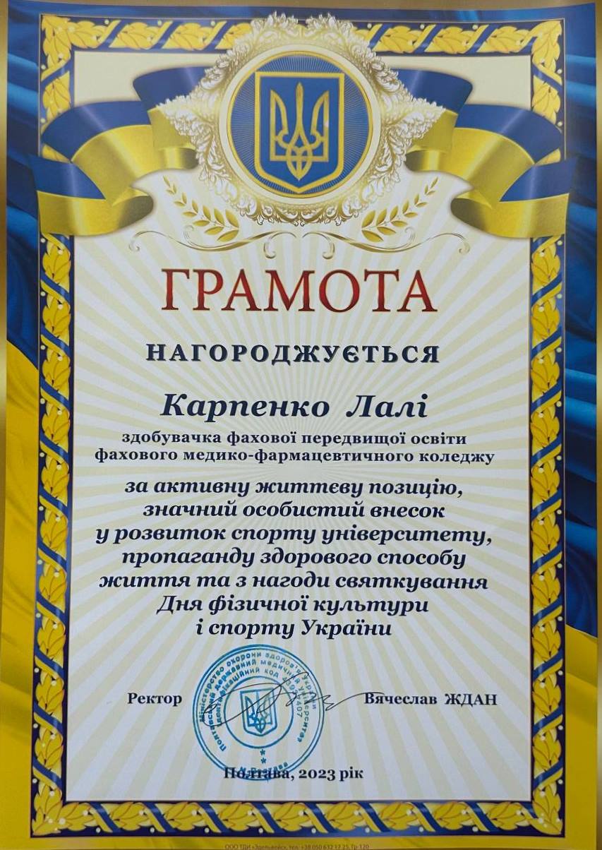З нагоди відзначення Міжнародного дня фізичної культури та спорту здобувачку освіти ОПП Фармація, промислова фармація Карпенко Лалі за активну життєву позицію, значний особистий внесок у розвиток спорту університету, пропаганду здорового способу життя нагороджено грамотою ректора ПДМУ.