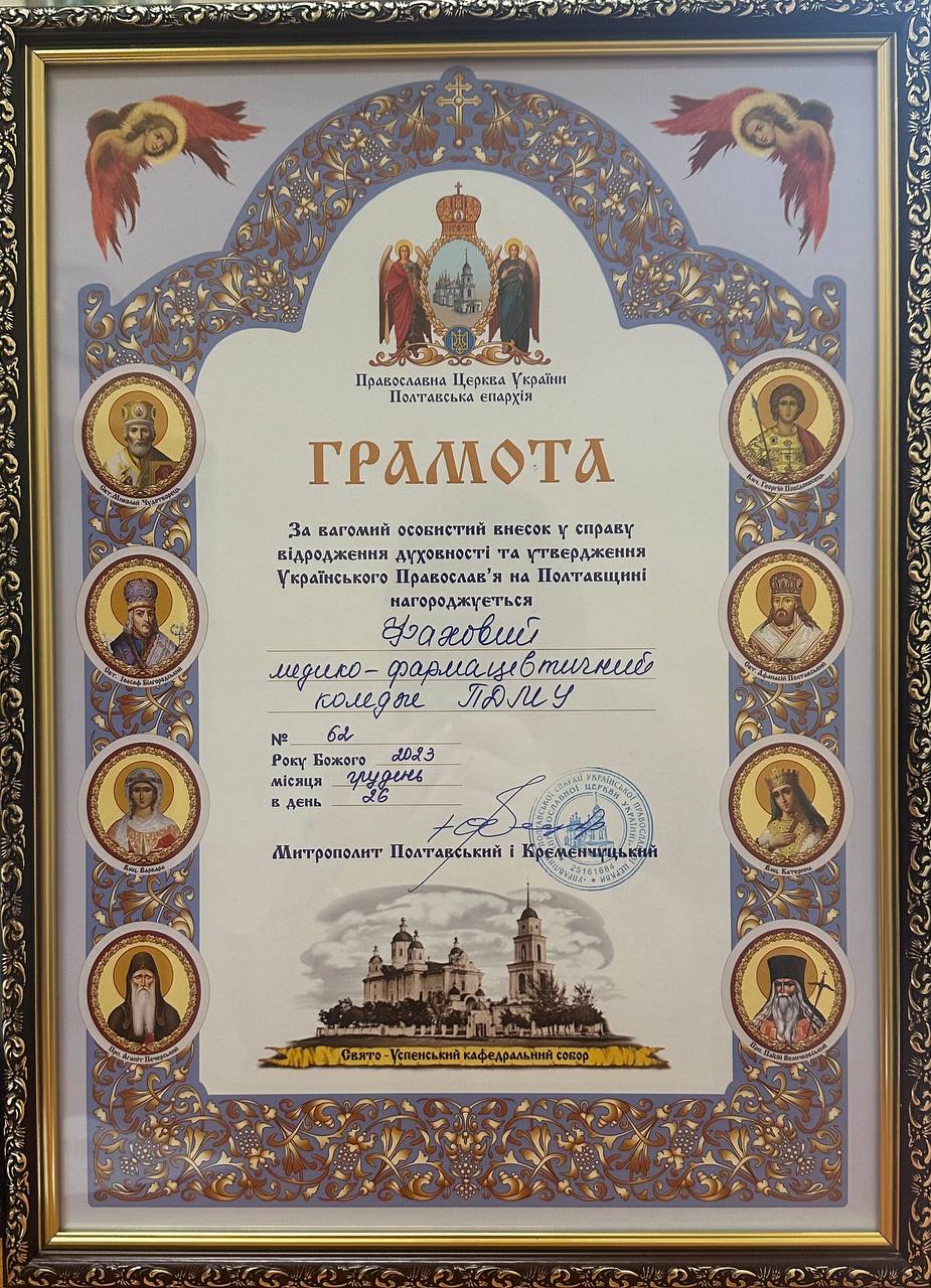 Вітаємо колектив Фахового медико-фармацевтичного коледжу ПДМУ з нагоди вручення грамоти "За вагомий особистий внесок у справу відродження духовності та утвердження Українського Православ'я на Полтавщині"!