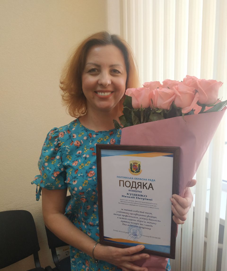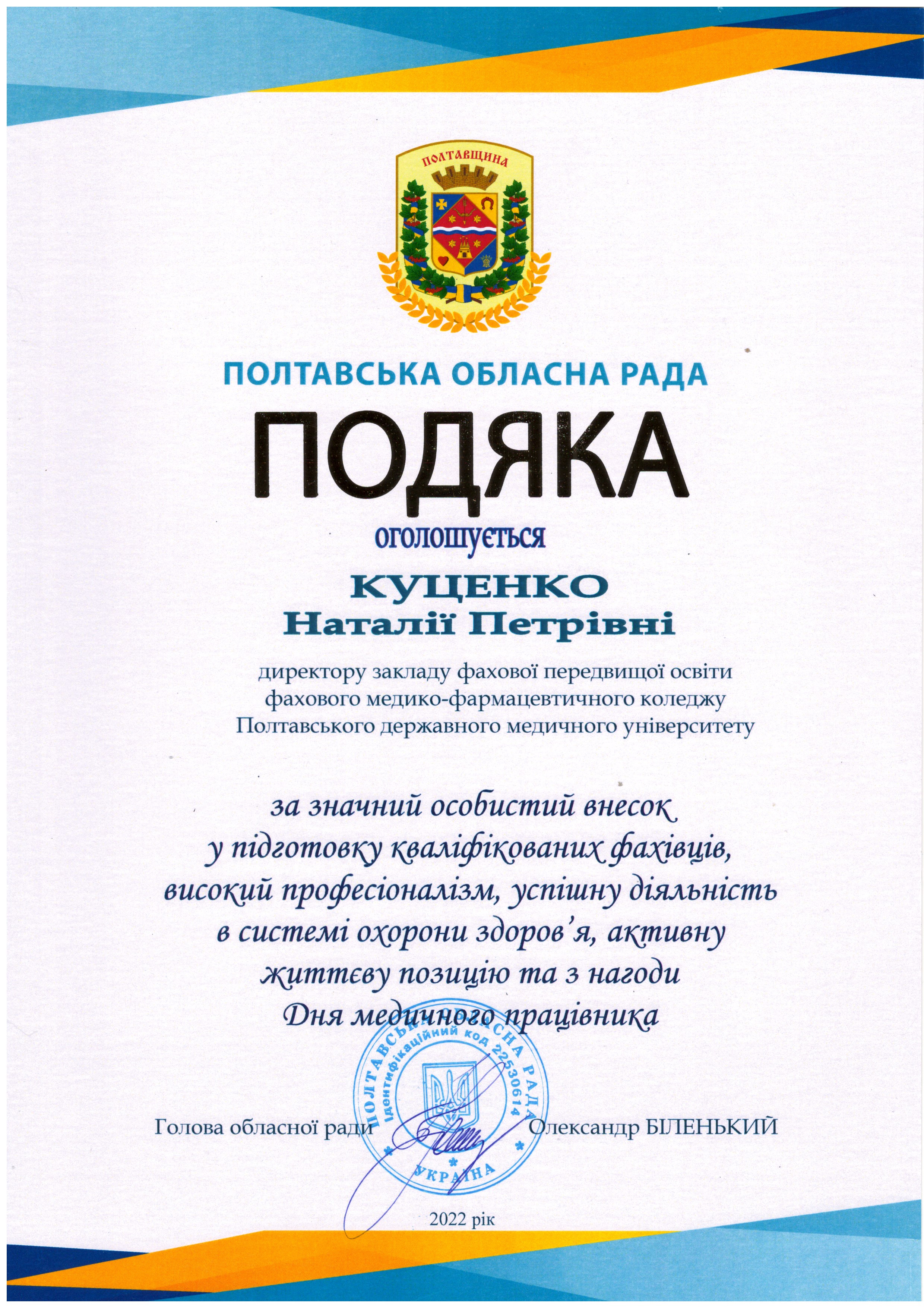Викладацький колектив Фахового медико-фармацевтичного коледжу ПДМУ щиро вітає директора Наталію КУЦЕНКО з нагородою Полтавської обласної ради за значний особистий внесок у підготовку кваліфікованих фахівців, високий професіоналізм, успішну діяльність в системі охорони здоров’я, активну життєву позицію та з нагоди Дня медичного працівника!