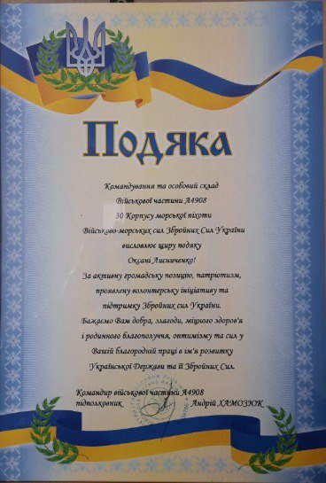 Викладацький колектив Фахового медико-фармацевтичного коледжу щиро вітає викладачку Оксану Лісніченко з отриманням подяки від Командування та особового складу військової частини А4908 30 Корпусу морської піхоти Військово-морських сил Збройних Сил України.