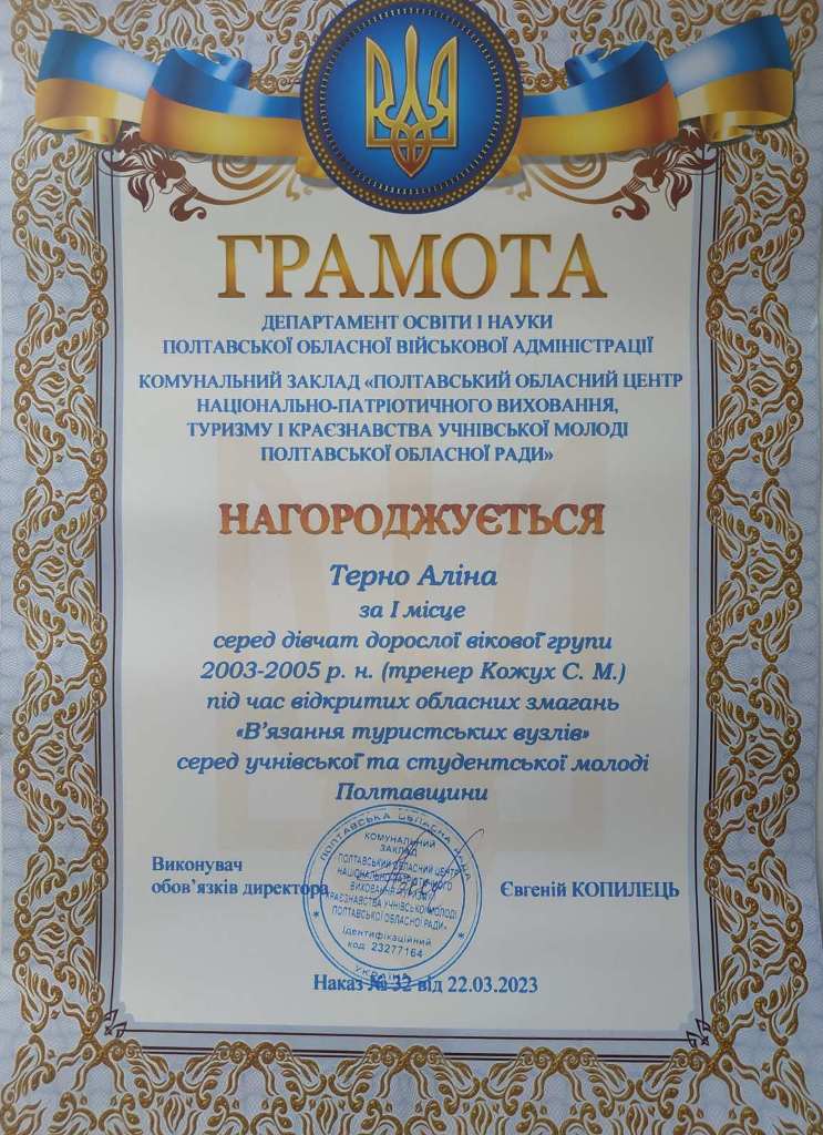 Колектив Фахового медико-фармацевтичного коледжу ПДМУ вітає здобувачку освіти фармацевтичного відділення ОПП Фармація Аліну Терно із перемогою у Відкритих змаганнях Полтавської області із "В'язання туристичних вузлів" серед учнівської та студентської молоді Полтавщини.