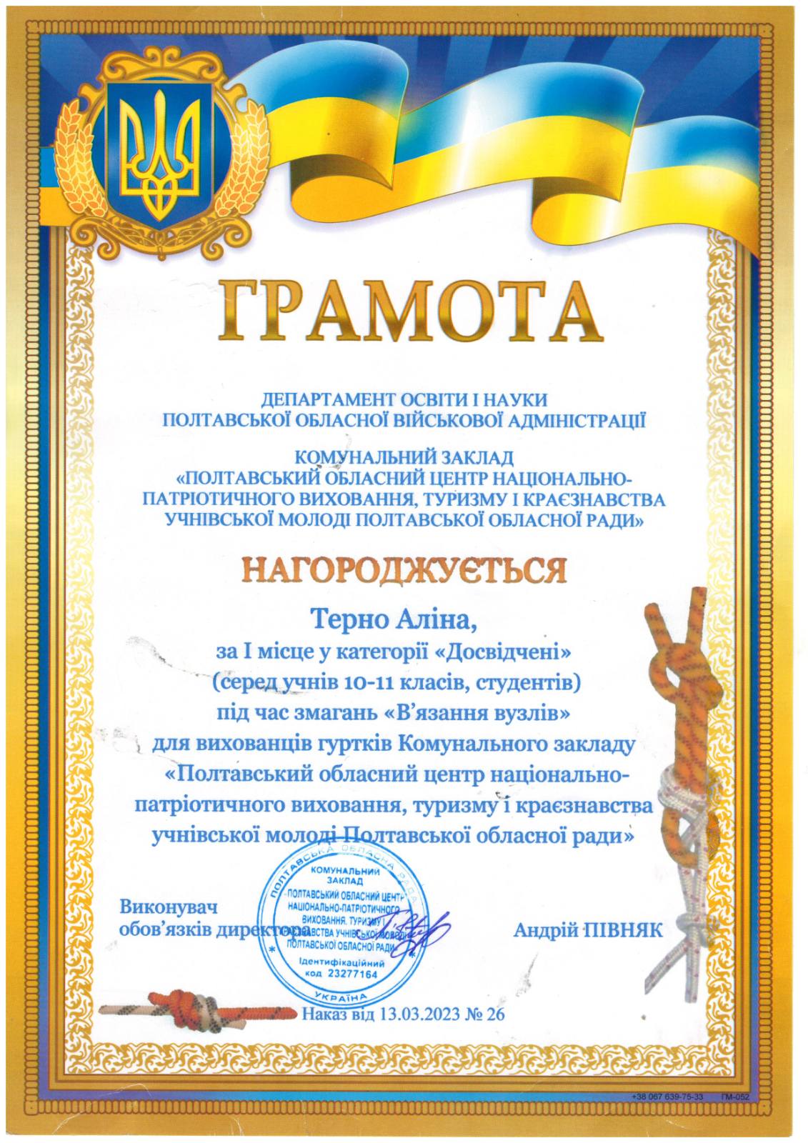 Адміністрація, педагогічний та студентський колектив Фахового медико-фармацевтичного коледжу ПДМУ вітає здобувачку освіти фармацевтичного відділення ОПП Фармація Аліну Терно із перемогою у змаганнях із "В'язання вузлів" у категорії "Досвідчені" серед учнів 10-11 класів та студентів.