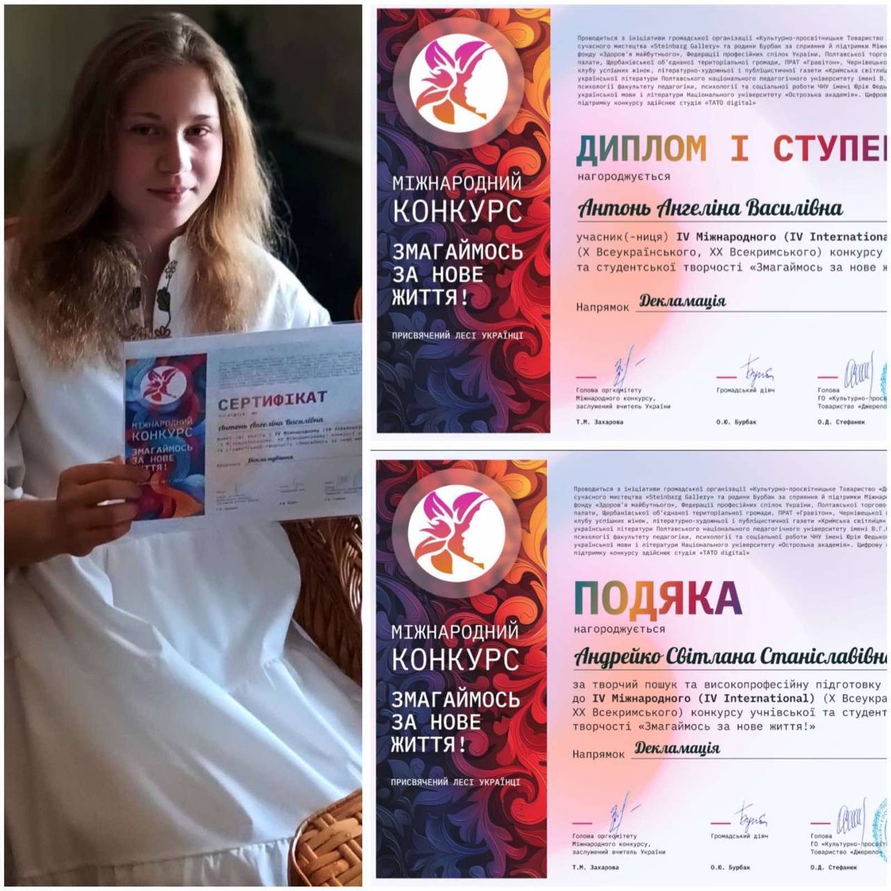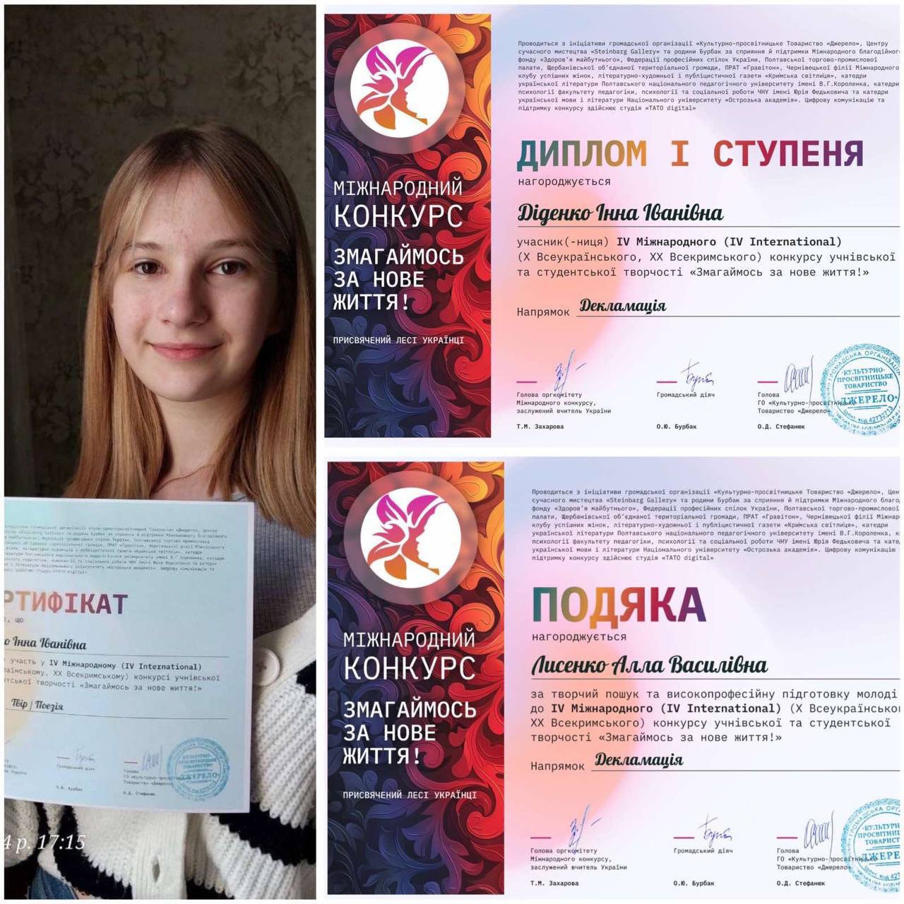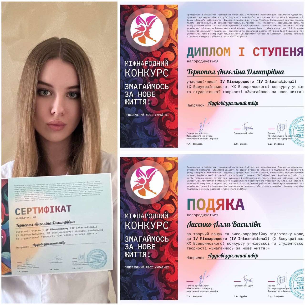 Здобувачки ОПП Сестринська справа - Ангеліна АНТОНЬ (номінація «Декламація») та ОПП Стоматологія ортопедична - Ангеліна ТЕРНОПОЛ (номінація «Аудіовізуальний твір»), Інна ДІДЕНКО (номінація «Декламація») стали призерками IV Міжнародного конкурсу учнівської та студентської творчості «Змагаймось за нове життя!», присвяченого Лесі Українці.