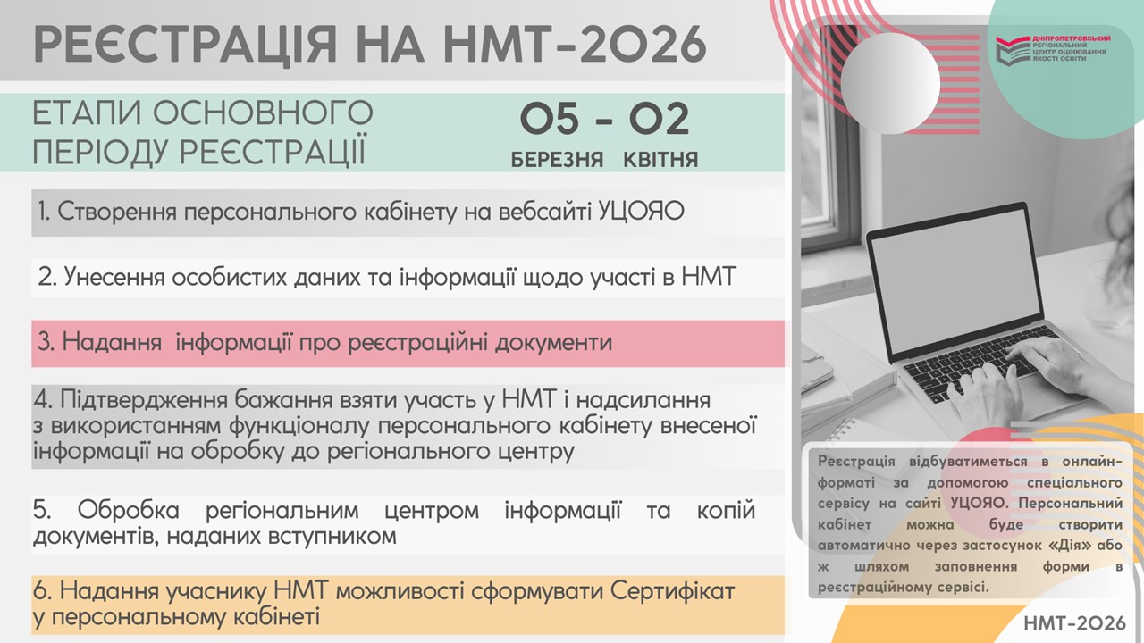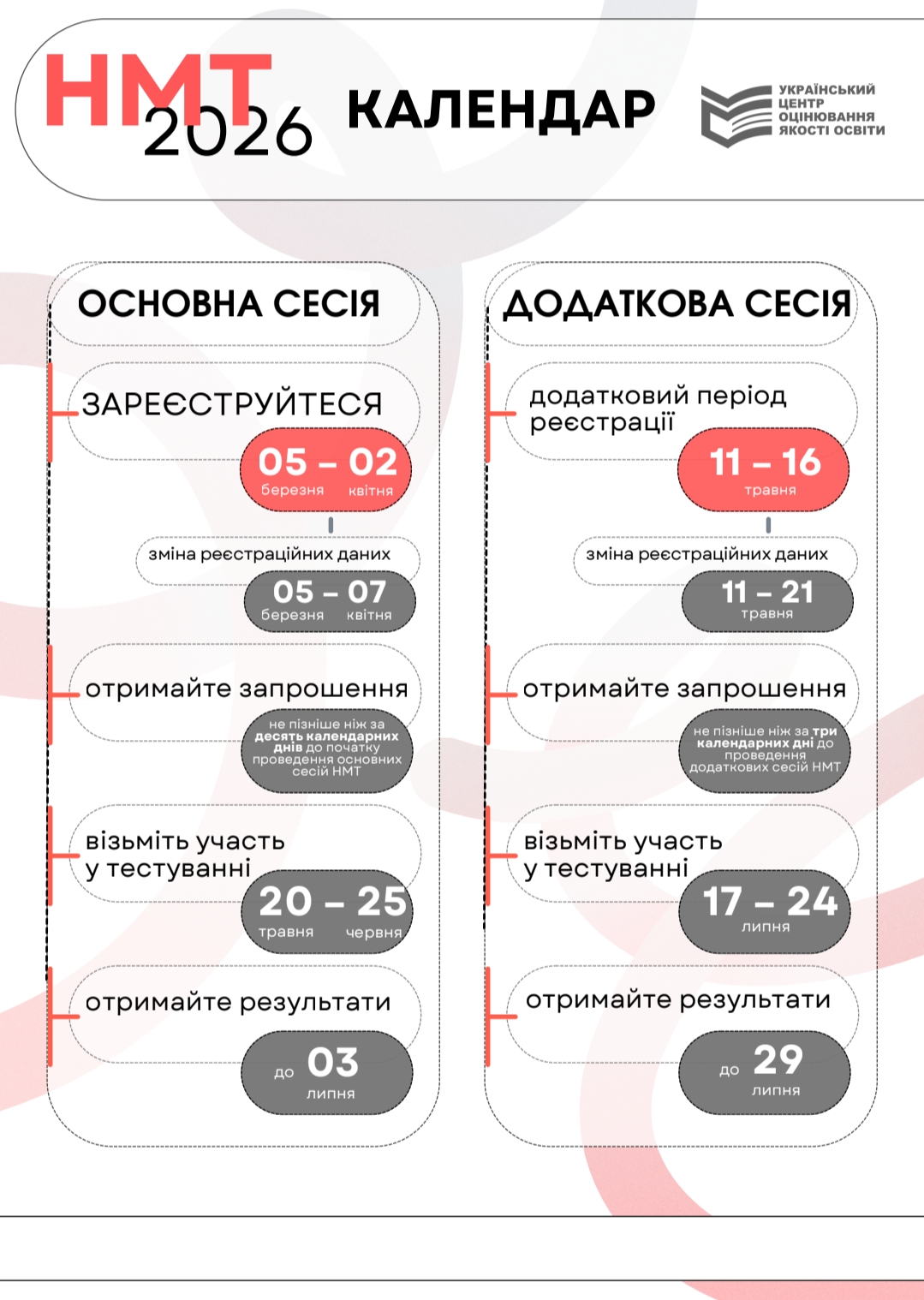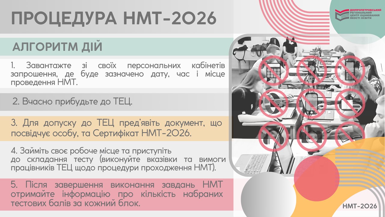 Вступні випробування на бакалаврські програми до закладів вищої освіти України, як і минулого року, буде проведено у форматі національного мультипредметного тесту (НМТ) на комп’ютерній основі. У межах НМТ кожен учасник буде виконувати завдання із 4 навчальних предметів, 3 з яких є обов’язковими (українська мова, математика та історія України), а 1 — на вибір із переліку (українська література, іноземна мова (англійська, німецька, французька, іспанська), біологія, хімія, фізика, географія). Предмет на вибір вступник вказуватиме під час реєстрації для участі в НМТ.