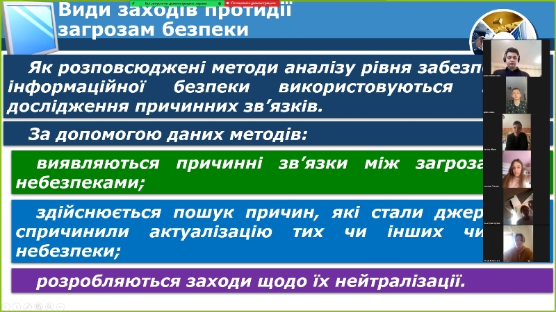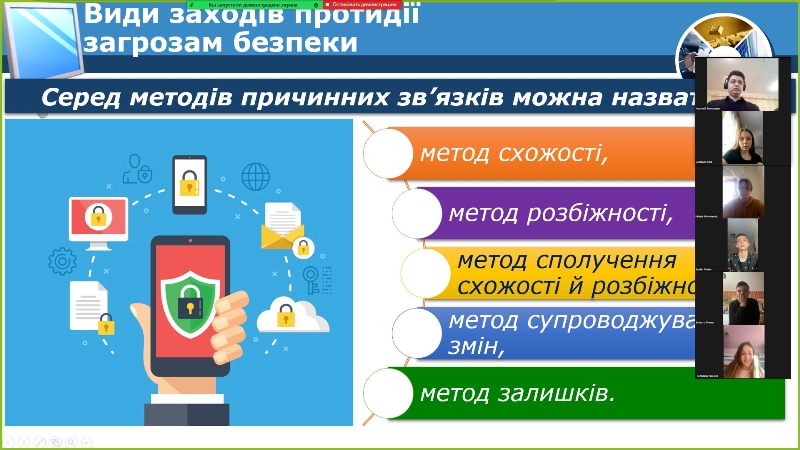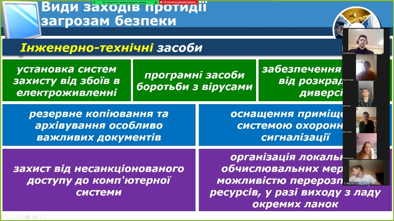Дев’ятого лютого 2022 року викладачем інформатики Солодом Анатолієм Вікторовичем було проведено відкрите заняття у дистанційному форматі за темою: «Об’єкти захисту. Види протидії загрозам безпеки». Метою проведення заняття було перевірити знання студентів про існуючі інтернет-небезпеки, визначити яка інформація підлягає захисту, розкрити поняття інформаційної системи, ознайомити з різноманітними заходами забезпечення безпеки інформації, інформаційних систем, і проаналізувати їх.