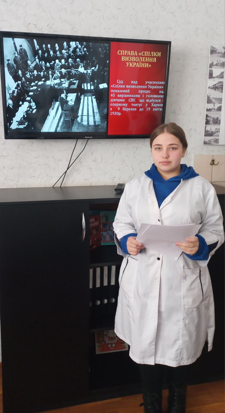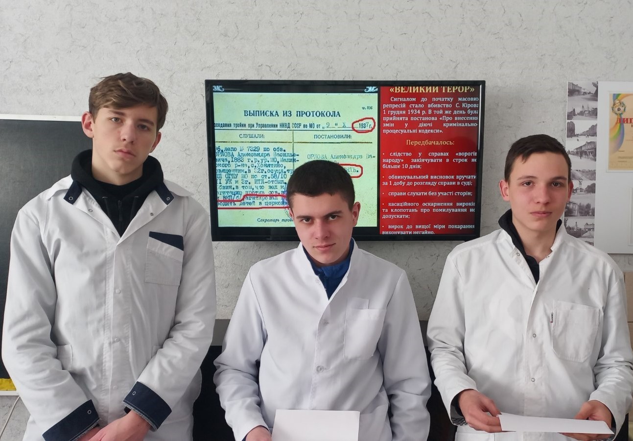 В ході заняття були розкриті причини розгортання масових репресій в умовах сталінського тоталітарного режиму, охарактеризовані їх основні етапи. Здобувачі освіти переконались в тому, що одним із найжорстокіших злочинів сталінізму був штучно організований голод 1932-1933 рр. Значна увага була приділена питанню знищення інтелектуальної еліти України, цілого покоління українських митців, яке назвали «Розстріляним Відродженням».