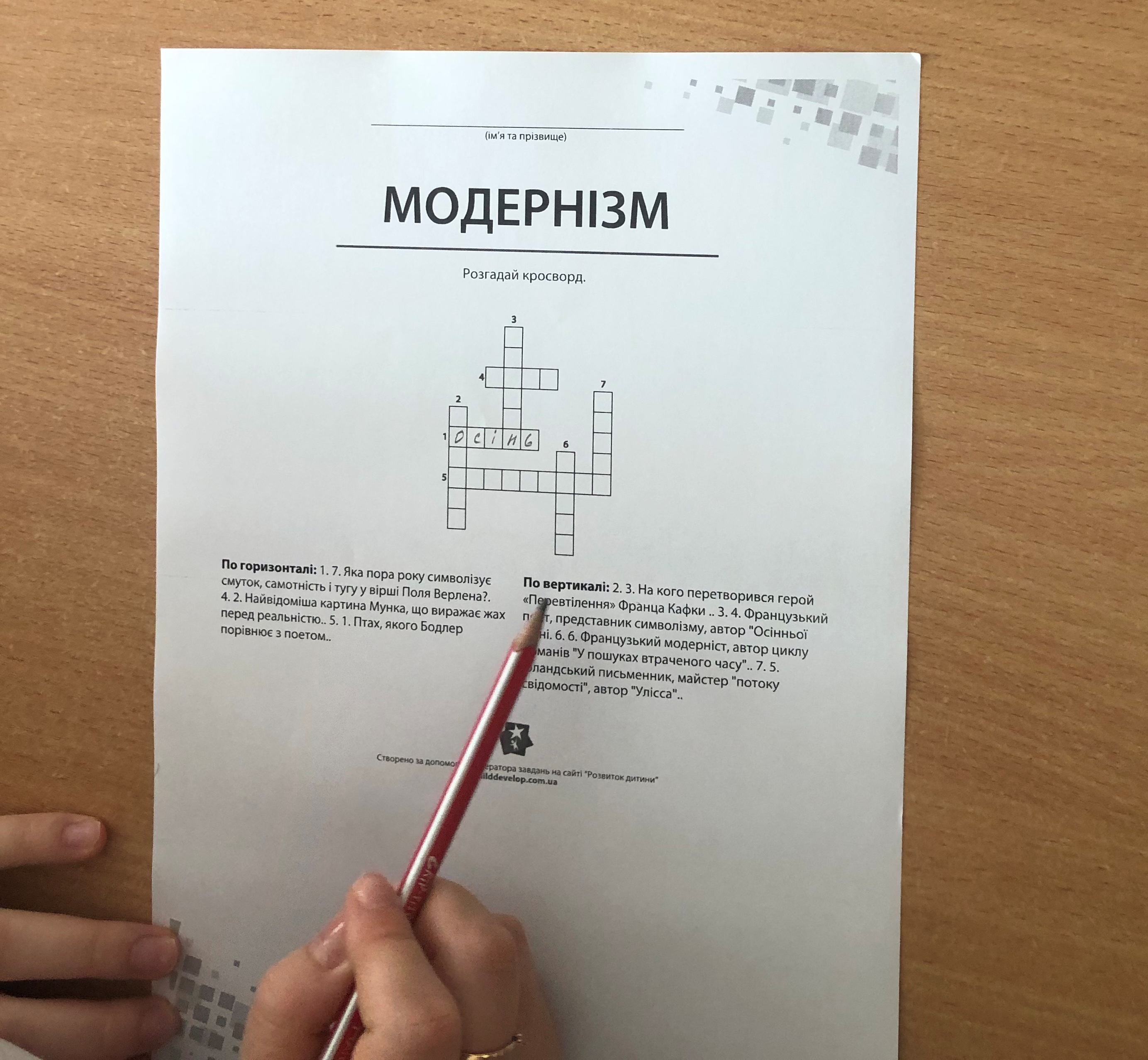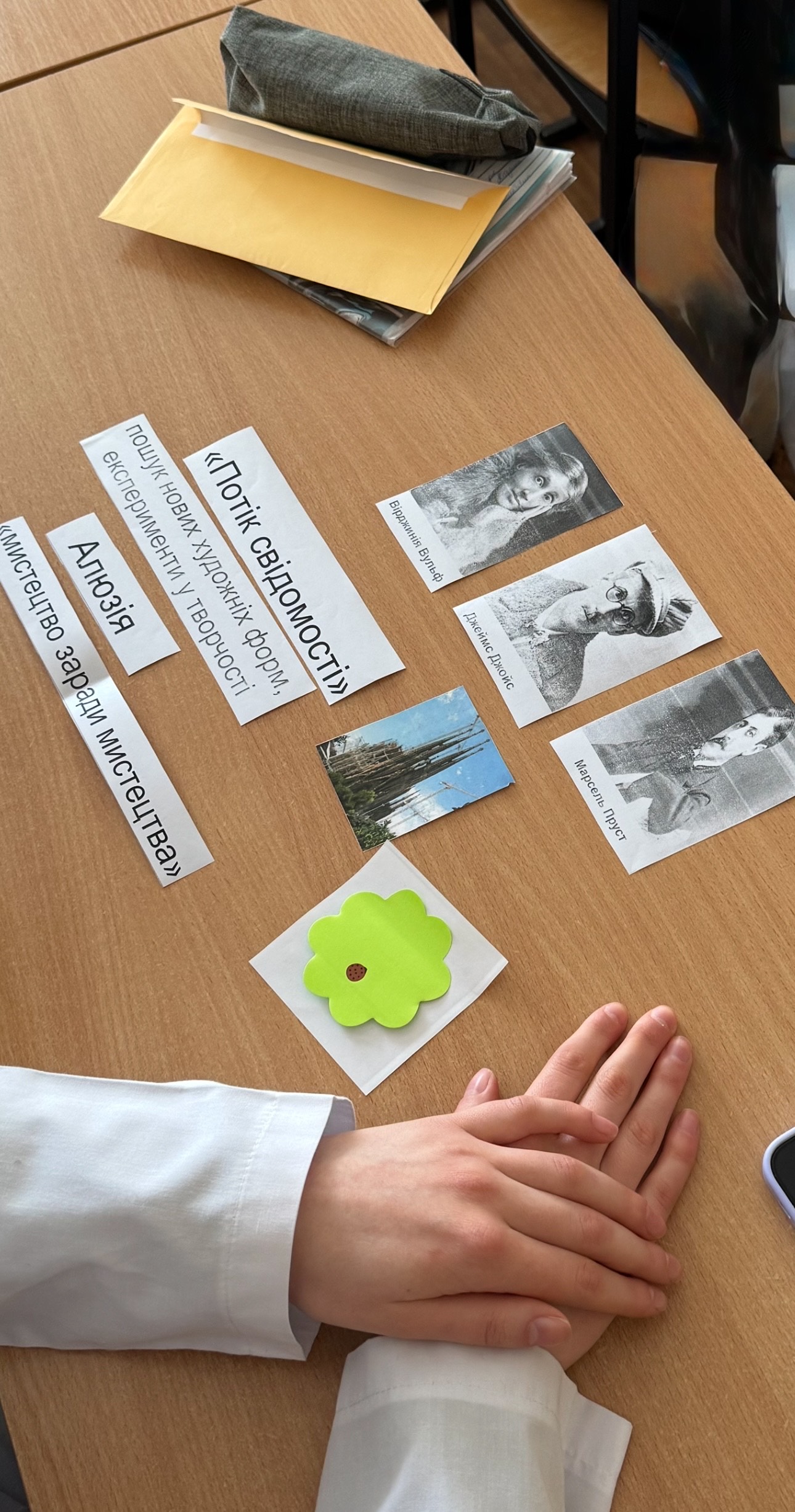 Заняття вийшло інтерактивним і динамічним, адже в процесі роботи студенти розпізнавали модерністські напрями за підказками в "конвертах", закріплювали ключові поняття за допомогою кросвордів, а також уважно аналізували біографію Кафки, виправляючи неточності в тексті з помилками.