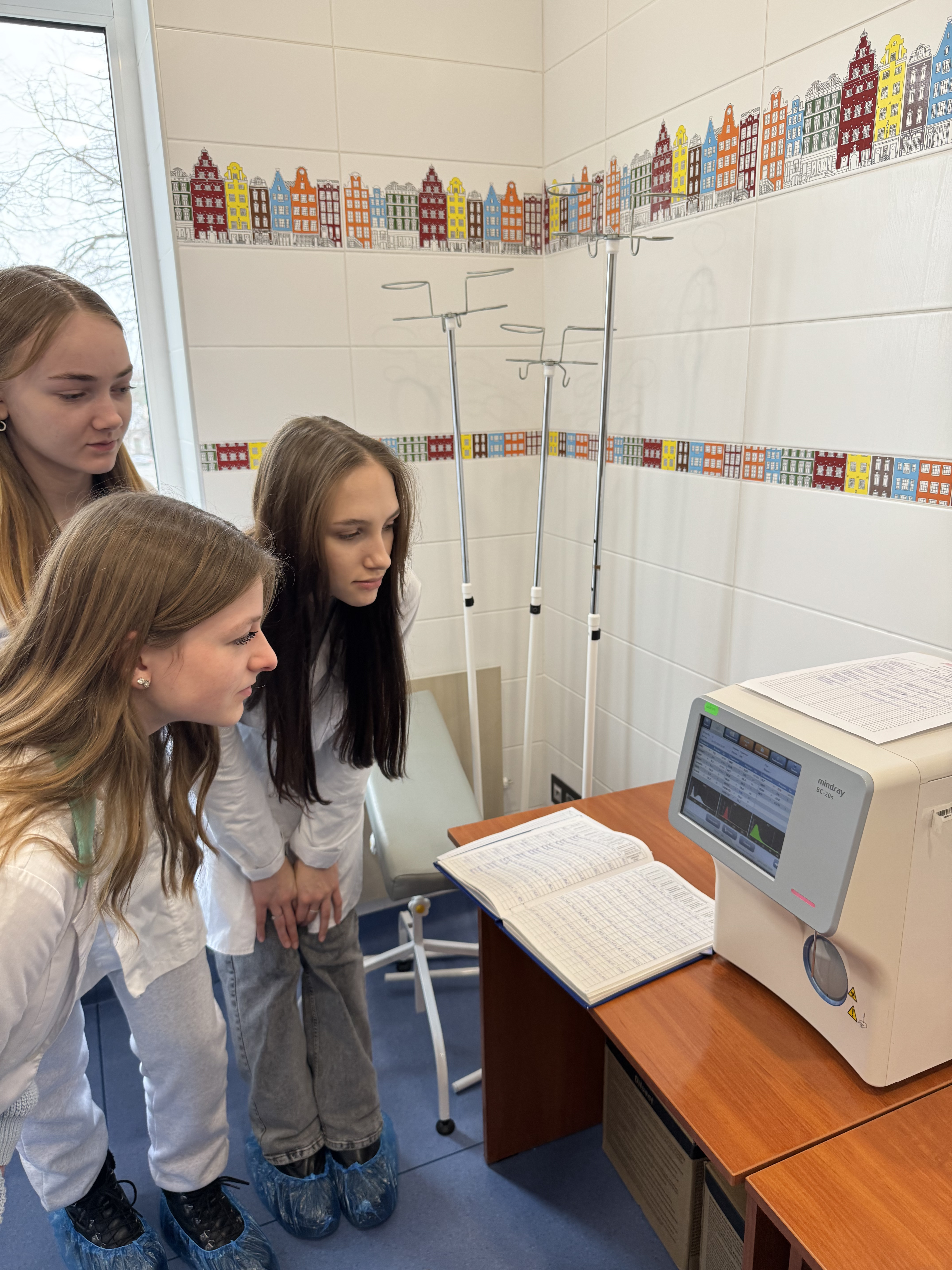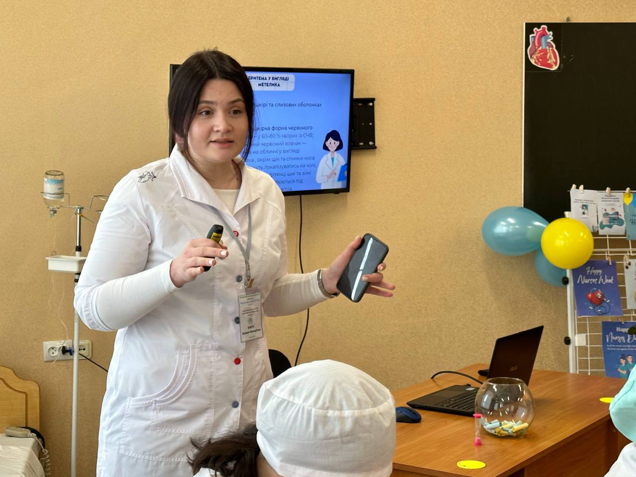 У межах екскурсії лікарка лікувально-діагностичного центру «Медіон KIDS» Ольга ПШЕНИШНА провела інтерактивну лекцію, з якої студенти дізналися про основні клінічні прояви, фактори ризику та підходи до надання медичної допомоги пацієнтам із кардіологічними патологіями. Викладачка медсестринства у внутрішній медицині Валерія БОБУХ особливу увагу приділила невідкладним станам, зокрема алгоритмам дій при захворюваннях серцево-судинної системи.