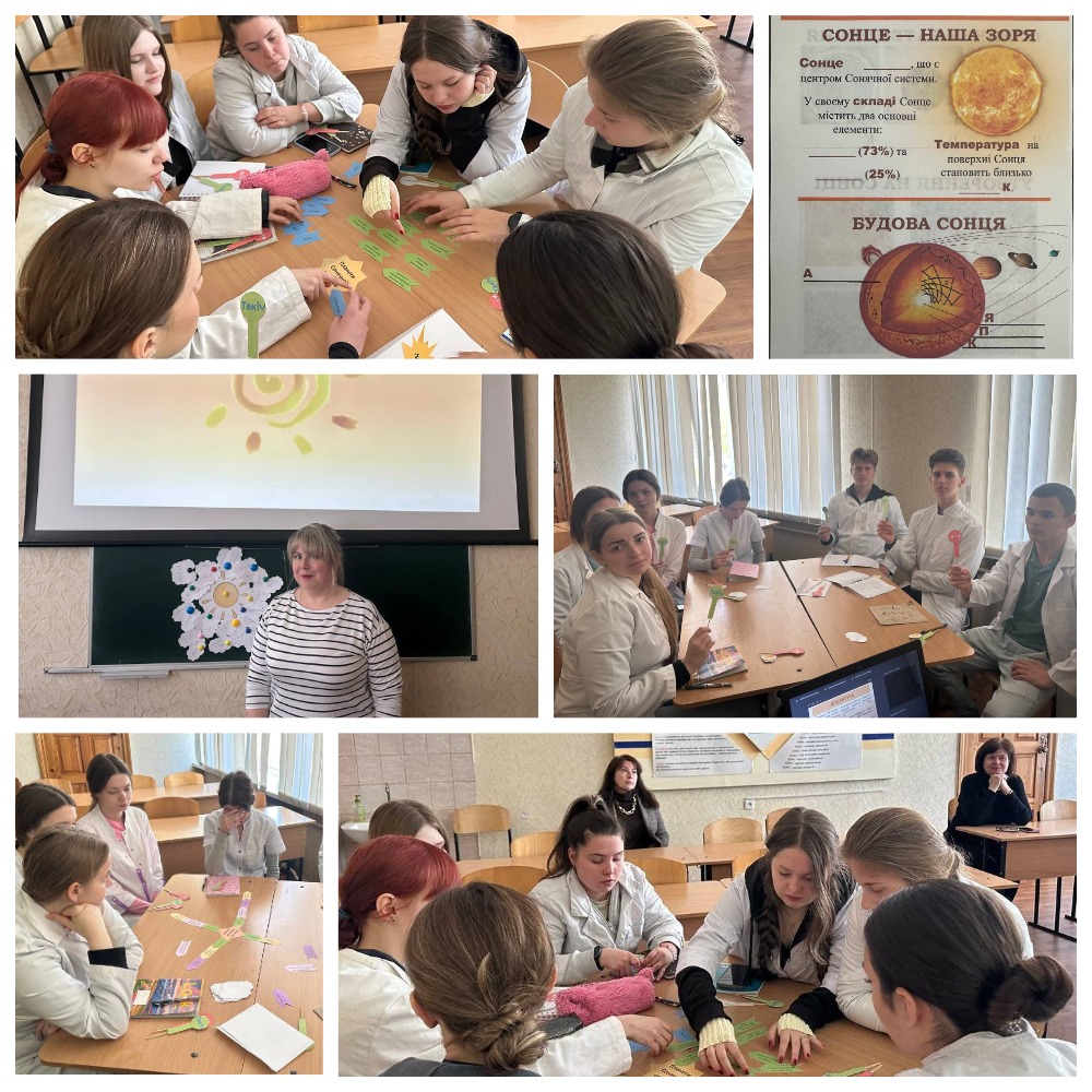 Таїсією Волковою, викладачкою фізики і астрономії, проведено відкрите заняття для здобувачів освіти ОПП Сестринська справа на тему «Сонце — наша зоря», спрямоване на формування уявлень про фізичну природу Сонця, його будову та значення для життя на Землі. Заняття поєднало традиційні та інтерактивні форми навчання, матеріал подавався з використанням мультимедійних презентацій, відеофрагментів та асоціативних методів для аналізу пройденого матеріалу.