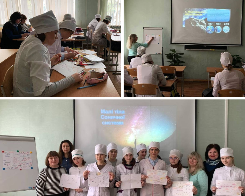 28 квітня викладач фізики і астрономії Таїсія ВОЛКОВА провела відкрите практичне заняття «Малі тіла Сонячної системи», під час якого здобувачі освіти ОПП Фармація дізналися про різноманітні об’єкти, що подорожують у навколоземному просторі та Сонячній системі, скористались симуляторами руху астероїдів та переконались, які ризики та наслідки вони несуть та чим загрожують людству. Протягом заняття студенти занотовували інформацію у вигляді інтелект-карти, що дозволило не лише впорядкувати велику кількість інформації, а й простежити зв’язки між космічними об’єктами. Такі карти значно полегшують сприйняття та навчають систематизувати зміст теми