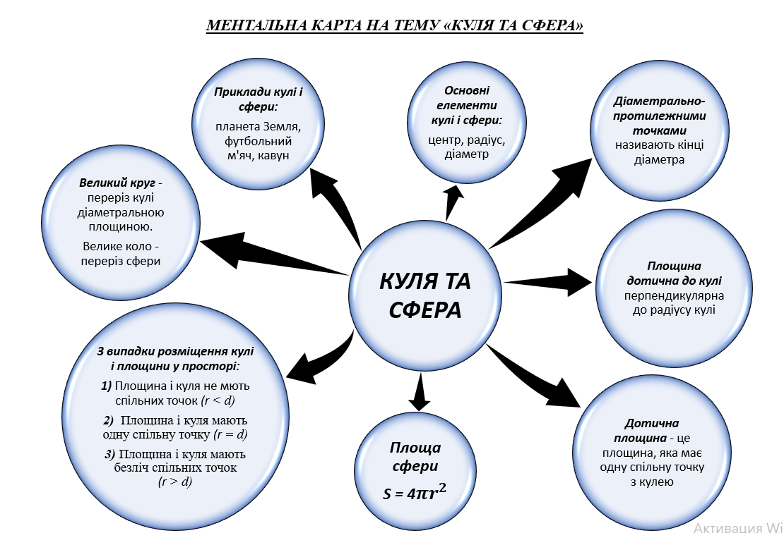 Для кращого засвоєння матеріалу було використано ментальну карту на тему «Куля і сфера», яка допомогла візуалізувати основні властивості та формули. Робота студентів з плакатом «Приклади кулі та сфери в природі й житті» дозволила пов’язати теоретичні знання з реальними прикладами, а обговорення контрольних питань відбувалося у формі інтерактивного діалогу.