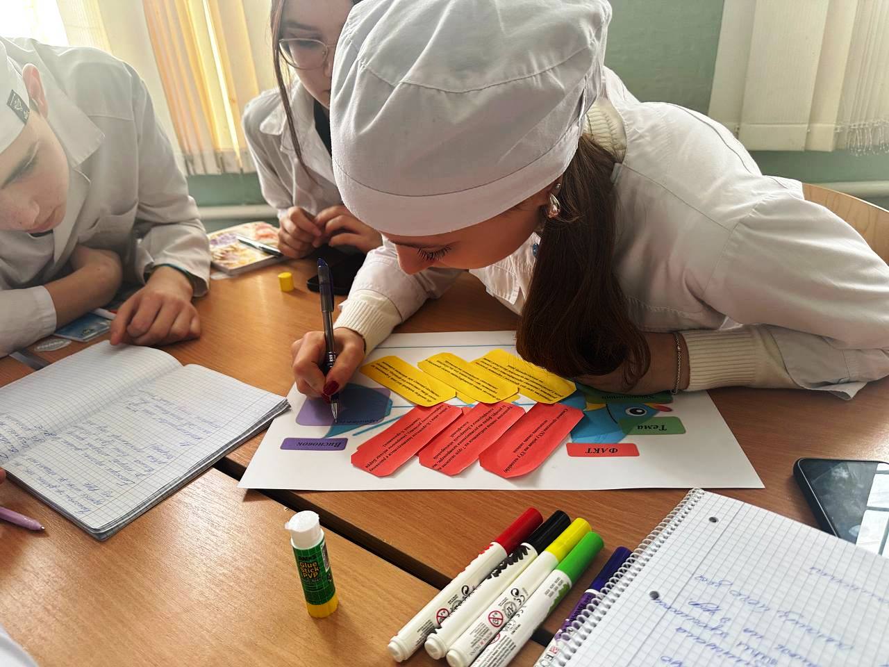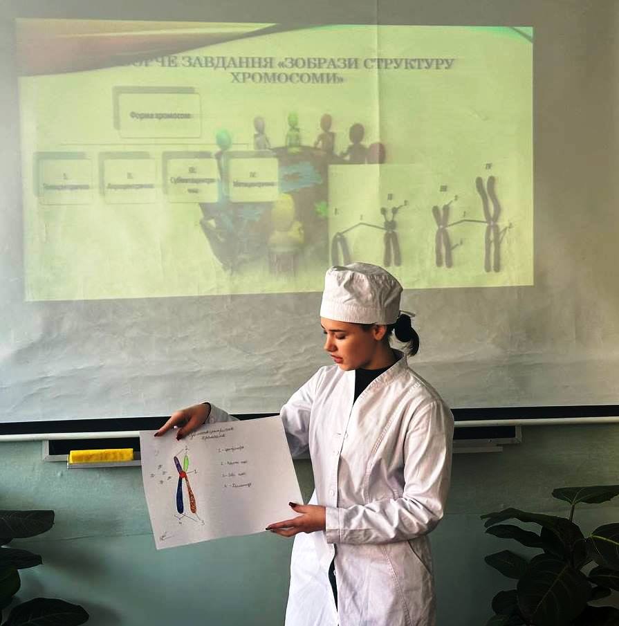 Студенти виступили з мінідоповідями про хромосомні аномалії, аналізували складні питання та користувалися прийомом Fishbone («риб'яча кістка») – ефективним способом розвитку критичного мислення, що допомагає встановлювати причинно-наслідкові зв'язки. Студенти активно працювали в командах, демонструючи злагоджену взаємодію та прагнучи якісно виконати всі поставлені завдання.
